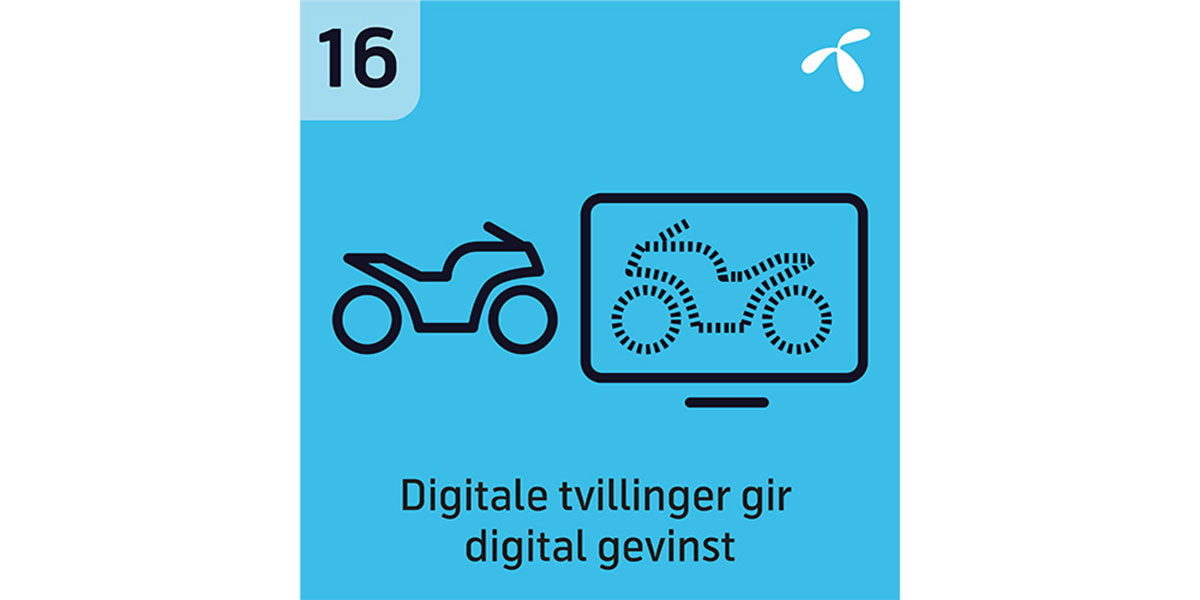 Digitale tvillinger vil bli vanlig i 2020. De vil bli et vanlig verktøy for planlegging, utvikling, drift og vedlikehold av eiendeler og infrastruktur. En digital tvilling er en kopi av et fysisk objekt, som en bil, en bygning, en vei eller en by.