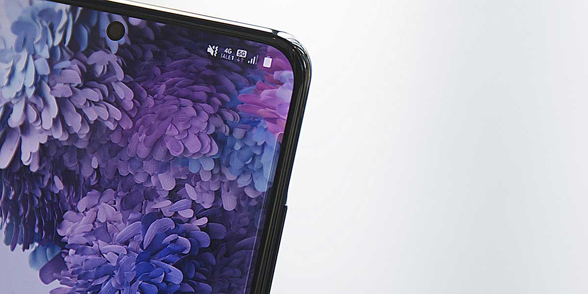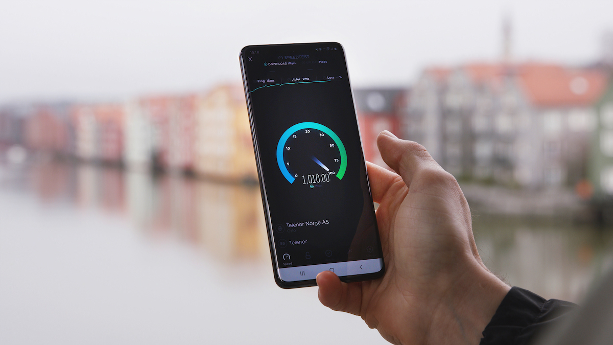 Vi overrekker en Samsung Galaxy S20+ som er tilkoblet 5G-nettet, og lar dem kjøre en hastighetstest. Nåla fortsetter å klatre – til den «sprenger skalaen», med deres ord. Nedlastingshastigheten overgår 1000 Mbit/s.