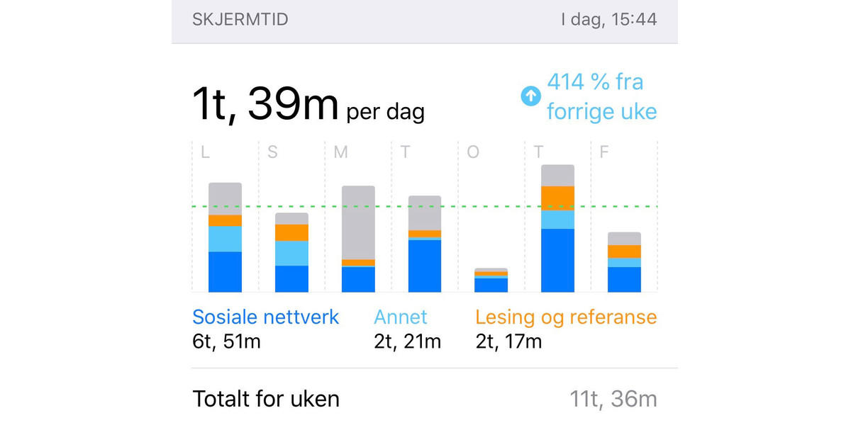 Noen vil sikkert få en liten aha-opplevelse når de begynner å utforske den nye «Skjermtid»-funksjonen på iPhone. Her finner du i klartekst hvor mye tid du har brukt på forskjellige sysler – fordelt på type aktivitet, men også helt ned på app-nivå.